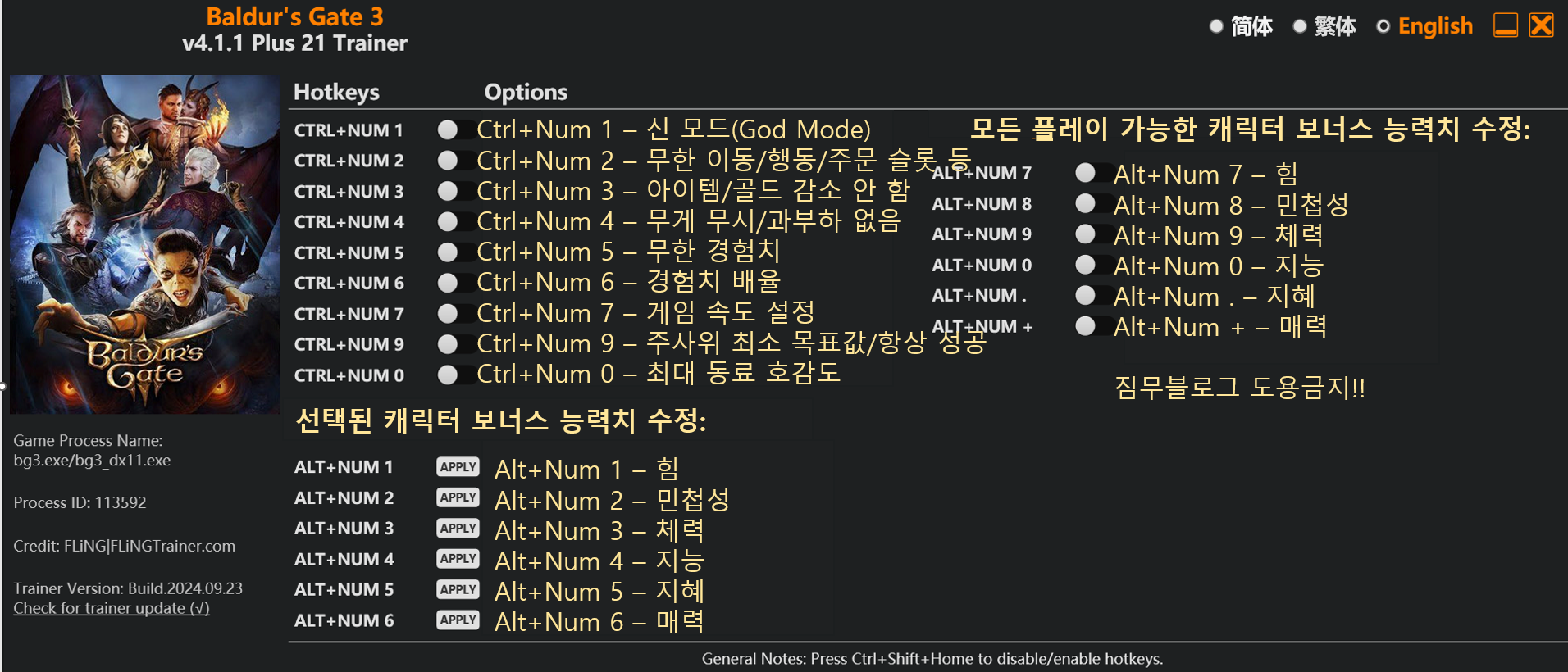 고침) 한글 [발더스 게이트3] v1.0~4.1.1 트레이너 - FLiNG +21 Baldur’s Gate 3 Trainer 한글동봉
